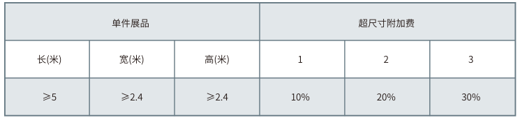 展览品中有任何单一件展品(连包装箱计算在内)超过3000公斤或者尺寸超过5米*2.4米*2.4米,主场运输服务商将加收超重超大附加费如下: